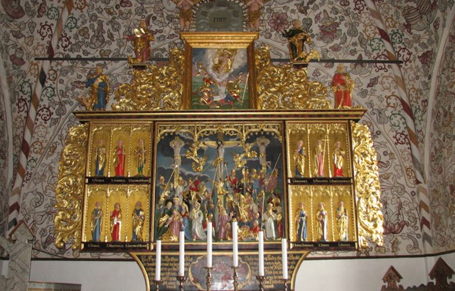 Foto: Kirsten Trampedach, 2007 //  Altertavlen i Møgeltønder Kirker er fra omkring år 1500. I midten har den Jesus på Golgata, og i de to fløje op mod står udskårne apostle.